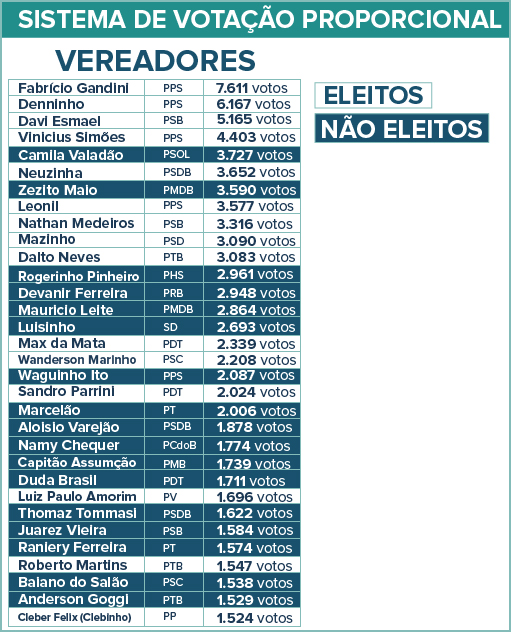 Isso acontece porque a eleição para vereador obedece a um sistema proporcional. Dessa forma, para conhecer os vereadores eleitos é necessário saber qual partido político foi vitorioso em uma eleição e, a partir daí, definir quais são os parlamentares mais votados dentro de cada agremiação.